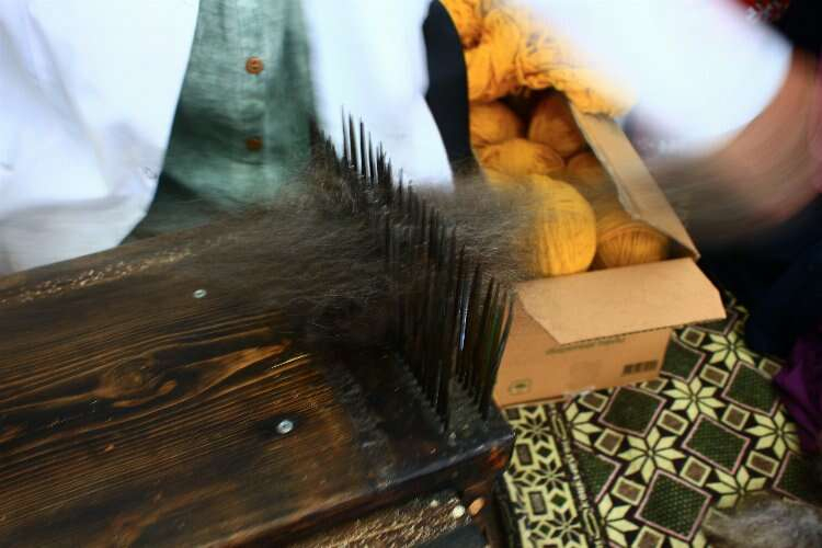 Yünü kirli yapağı halde alıyoruz. Ehramda, koyunyününün bütün kısmını kullanamıyoruz. Sadece karın kısmındaki yünü kullanıyoruz. Bu da yapağın üzerindeki en kalite yün. En uzun, en ince, bükülebilen kıvamda olan bölge karın kısmındaki tarafıdır. Diğer taraftaki yünleri farklı ürünler için kullanıyoruz Burada en çok dikkat ediğimiz şeylerden bir tanesi; yünün o sene içerisinde kırpılmış olması. Malumunuz koyunlar haziran ve temmuz başları gibi kırpılır. Biz, o esnada gidip yünlerimizi seçiyoruz. Usta öğrencilerimiz, dere kenarına gidiyor geleneksel yöntemlerle tokaşlayarak yıkıyorlar. Yıkanıp kurutuluyor, çırpılıyor. Tekrar yıkanıp, tekrar kurutulup çırpılıyor. Bu olay en az üç kere tekrarlanıyor. Çünkü yünü doğal yıkıyoruz. Yünün dokusunu bozmamak için, kimyasal bir şey kullanmıyoruz. Eğirirken yünün kalitesini düşürmemek adına sadece su ile tokaşlayarak yıkıyoruz. Ondan sonra tarıyoruz. Tararken şöyle bir şeye dikkat ediyoruz; bu aşamada ustamız aynı zamanda tonlamalar yapıyor. Sadece siyah yapacaksak siyah koyunun rengini tek renkle tarıyor. Ama şekeriboz dediğimiz bir tekniği kullanıyoruz. Gri bir ton elde etmek istiyorsak, siyah yünlerle beyaz yünü aynı anda tarıyoruz. Bu sadece yaptığımız o ehram için geçerli, başka ehramda o tonu tutturamıyoruz. Yani tek ürün tek renk olmuş oluyor. El işçiliği olduğu için. Tarandıktan sonra teşir dediğimiz eğirme aletiyle eğirme işlemi yapıyoruz. Bu bizim yörede teşir başka yörelerde kirman, bazı yörelerde iğ deniliyor. Eğirme aletiyle ustalarımız eğiritikden sonra, sıcak su ile haşlama işlemi yapılıyor. Ondan sonra çiriş dediğimiz bir otla çirişleme yapılıyor. Bu otun kökünden elde edilen yapışkan malzeme ile çiriş malzemesini suda muhallebi şekline gelecek kadar kaynatıyoruz. Elde ediğimiz iplikleri içine koyuyoruz. Daha sonra çıkartıp uzatıyoruz. Bir gün ya da iki gün uzatma şeklinde bekliyor. Çünkü yün çok dayanıklı bir malzeme değil. Çiriş işlemiyle dayanıklı hale getiriyoruz. Yani apreleme yapıyoruz. Bekledikten sonra tezgâha atıyoruz. Tezgâhta dokunuyor. Bunu da tamamen eski yöresel tezgâhlarda dokunuyor.