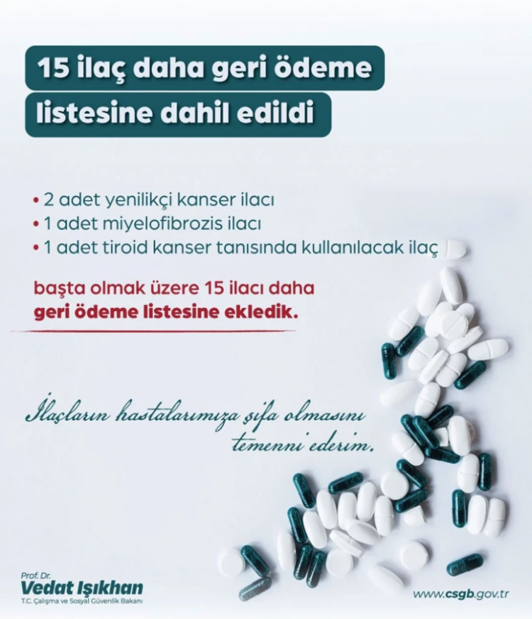 Sosyal medya hesabından paylaşım yapan Bakan Işıkhan, "Sosyal Güvenlik Kurumumuzun düzenlemesiyle kanser hastalığıyla mücadelede kullanılan ilaçlar başta olmak üzere 15 ilacı daha geri ödeme listesine aldık." dedi.