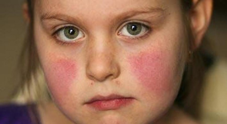 • Yanaklarda "tokat izi" görünümü: Parlak kırmızı bir döküntü en karakteristik belirtidir.