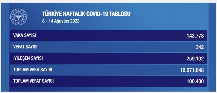Buna göre, 8-14 Ağustos'ta 143 bin 778 kişinin testi pozitif çıktı, 342 kişi yaşamını yitirdi, iyileşenlerin sayısı ise 259 bin 102 oldu. Kovid-19 vaka sayısı 1-7 Ağustos haftasında 232 bin 253 olarak açıklanmıştı.