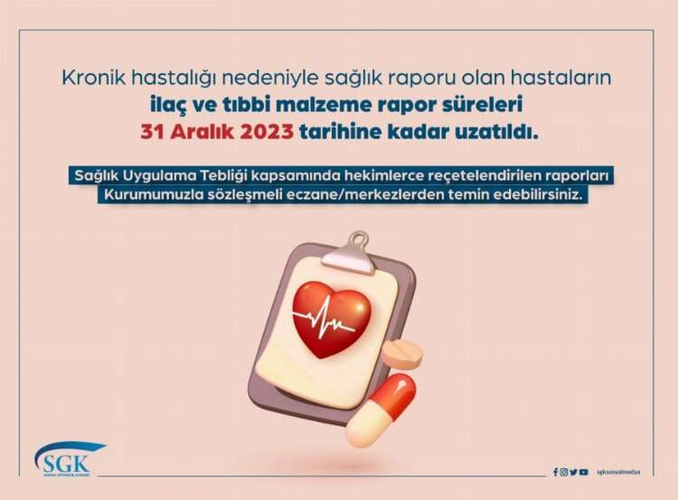 SGK'dan yapılan açıklamada kronik rahatsızlığı sebebiyle sağlık raporu olan hastaların ilaç ve tıbbi malzeme rapor sürelerinin 31 Aralık 2023 tarihine kadar uzatıldığı bilgisi paylaşıldı.