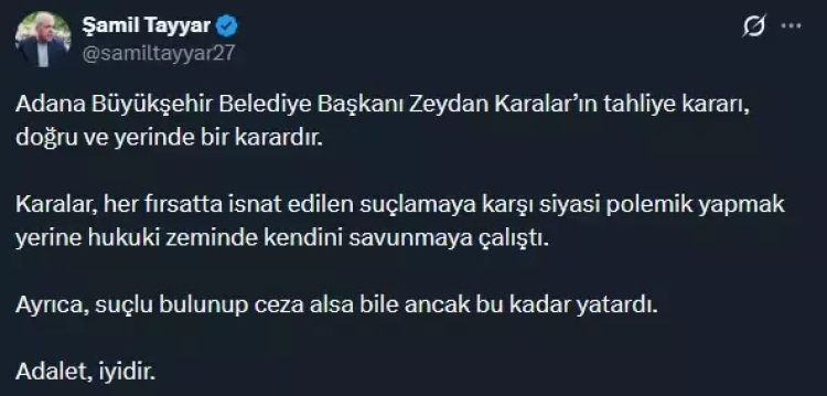 Karalar'ın tahliyesinin ardından AK Partili Şamil Tayyar'dan dikkat çeken bir yorum geldi. Sosyal medya hesabından açıklama yapan Tayyar, "Adana Büyükşehir Belediye Başkanı Zeydan Karalar'ın tahliye kararı, doğru ve yerinde bir karardır" dedi.
