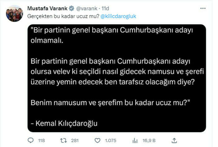 Bakan Mustafa Varank, mesajında Kılıçdaroğlu'nun etiketleyerek "Gerçekten bu kadar ucuz mu?" diye seslenerek, CHP Genel Başkanı'nın daha önce dile getirdiği sözleri şöyle paylaştı: