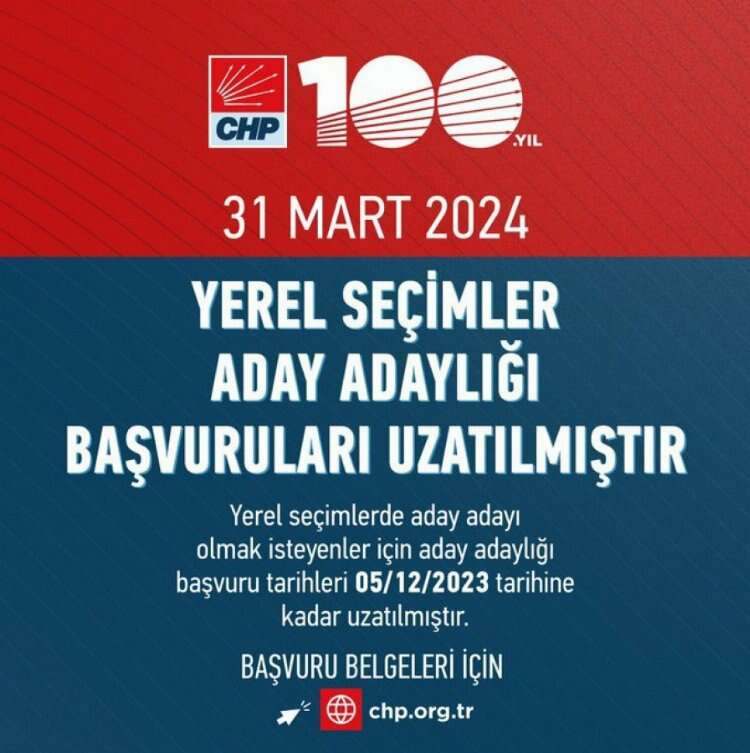 "Yerel seçimlerde aday adayı olmak isteyenler için aday adaylığı başvuru tarihleri 05/12/2023 tarihine kadar uzatılmıştır."