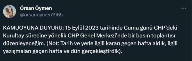 Öymen yaptığı açıklamada "KAMUOYUNA DUYURU: 15 Eylül 2023 tarihinde Cuma günü CHP’deki Kurultay sürecine yönelik CHP Genel Merkezi’nde bir basın toplantısı düzenleyeceğim. (Not: Tarih ve yerle ilgili kararı geçen hafta aldık, ilgili yazışmaları geçen hafta ve dün gerçekleştirdik)." ifadelerini kullandı.