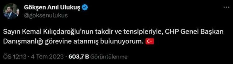 Gökşen Anıl Ulukuş 4 Temmuz tarihinde yaptığı Twitter paylaşımında "Sayın Kemal Kılıçdaroğlu’nun takdir ve tensipleriyle, CHP Genel Başkan Danışmanlığı görevine atanmış bulunuyorum." ifadelerini kullanmıştı.