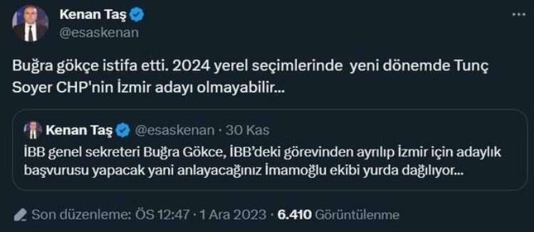 Öte yandan Gökce'nin istifasıyla ilgili gazeteci Kenan Taş'tan dikkat çeken bir yorum geldi. Sosyal medya hesabından 30 Kasım'da yazdığı mesajı paylaşan Taş, "Buğra gökçe istifa etti. 2024 yerel seçimlerinde yeni dönemde Tunç Soyer CHP'nin İzmir adayı olmayabilir" dedi.