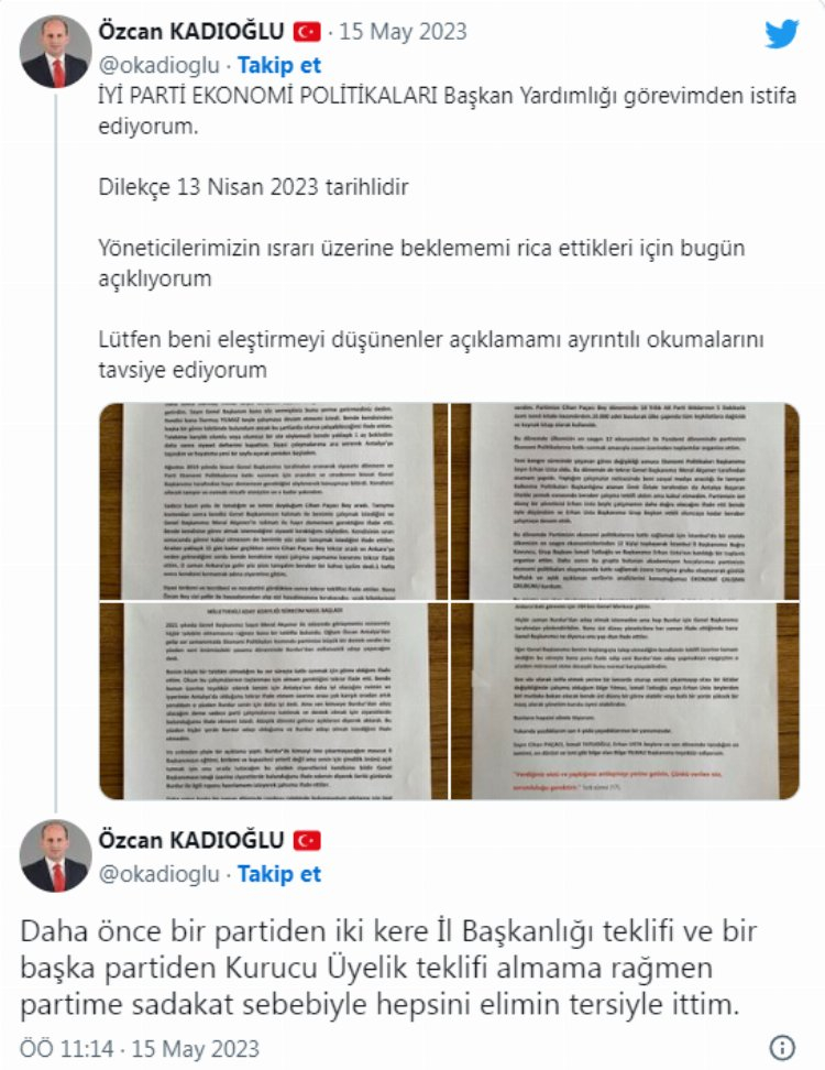 Kadıoğlu yaptığı paylaşımda "İYİ Parti Ekonomi Politikaları Başkan Yardımlığı görevimden istifa ediyorum. Dilekçe 13 Nisan 2023 tarihlidir. Yöneticilerimizin ısrarı üzerine beklememi rica ettikleri için bugün açıklıyorum. Lütfen beni eleştirmeyi düşünenler açıklamamı ayrıntılı okumalarını tavsiye ediyorum" ifadelerini kullandı.