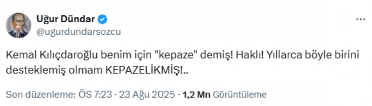 X platformundan paylaşımda bulunan Dündar, "Kemal Kılıçdaroğlu benim için "kepaze" demiş! Haklı! Yıllarca böyle birini desteklemiş olmam KEPAZELİKMİŞ!.." dedi.