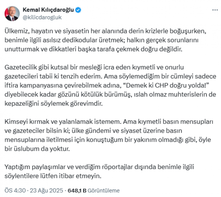 Kılıçdaroğlu, Uğur Dündar hakkında yaptığı paylaşımda, "Gazetecilik gibi kutsal bir mesleği icra eden kıymetli ve onurlu gazetecileri tabii ki tenzih ederim. Ama söylemediğim bir cümleyi sadece iftira kampanyasına çevirebilmek adına, "Demek ki CHP doğru yolda!" diyebilecek kadar gözünü kötülük bürümüş, ıslah olmaz muhterislerin de kepazeliğini söylemek görevimdir" ifadelerini kullandı.