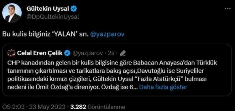 Sosyal medyada ortaya atılan bir başka iddiada ise "Babacan Anayasa’dan Türklük tanımının çıkartılması ve tarikatlara bakış açısı,Davutoğlu ise Suriyeliler politikasındaki kırmızı çizgileri, Gültekin Uysal “Fazla Atatürkçü” bulması nedeni ile Ümit Özdağ’a direniyor. Özdağ ise 6 partinin de imza atacağı bir “Mutabakat metni” istiyor ve tek bir lider bile bu metni imzalamazsa işbirliğini kabul etmeyeceği ifade ediliyor. Açıklamanın uzamasının nedeninin bu olduğu iddia ediliyor" denmişti. Celal Eren Çelik'in bu paylaşımını alıntılayan Demokrat Partisi lideri Gültekin Uysal, iddiaları yalanladı.