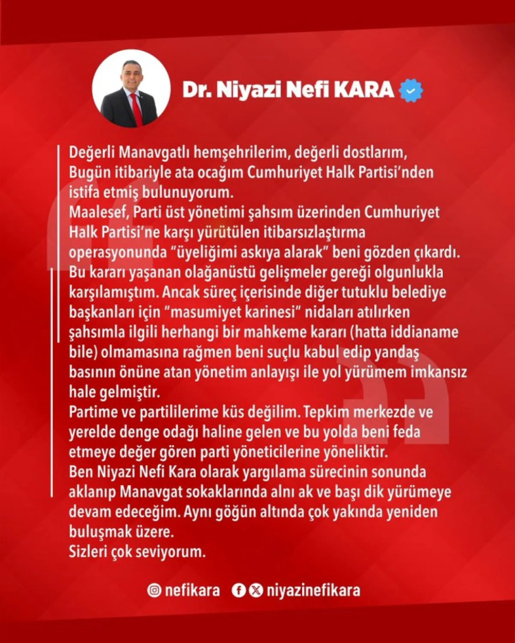 Manavgat Belediye Başkanı Niyazi Nefi Kara istifa açıklamasını, "Maalesef Parti üst yönetimi, şahsım üzerinden Cumhuriyet Halk Partisi’ne karşı yürütülen itibarsızlaştırma operasyonunda “üyeliğimi askıya alarak” beni gözden çıkardı" sözleriyle duyurdu.
