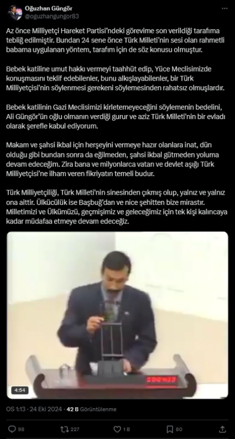 Oğuzhan Güngör, MHP TBMM Grup Danışmanlığı görevinden el çektirilme sebenin de MHP Genel Başkanı Devlet Bahçeli'nin terörist başını TBMM'de konuşabileceği söylemini eleştirmesi. Güngör, babasının yolundan gittiğini ve babasına uygulanan aynı yönteme maruz kaldığını söyledi.