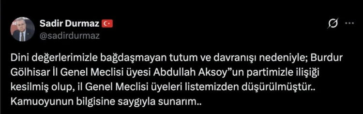 Durmaz, açıklamasında "Dini değerlerimizle bağdaşmayan tutum ve davranışı nedeniyle; Burdur Gölhisar İl Genel Meclisi üyesi Abdullah Aksoy”un partimizle ilişiği kesilmiş olup, il Genel Meclisi üyeleri listemizden düşürülmüştür.