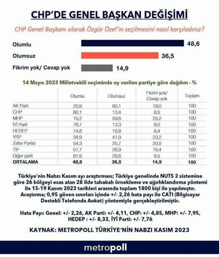 Yapılan araştırmalarda Özgür Özel’in genel başkan seçilmesinin CHP’nin oylarına etkisi ile CHP’deki genel başkanlık değişiminin halk tarafından nasıl karşılandığına ilişkin sorulara yanıt arandı. ‘CHP Genel Başkanı olarak Özgür Özel’in seçilmesini nasıl karşıladınız?’ sorusuna ankete katılanların yüzde 48,6’sı olumlu, yüzde 36,5’i olumsuz şeklinde yanıt verdi. Yüzde 14,9’luk bir oran ise ‘fikrim yok’ şeklinde yanıt verdi.