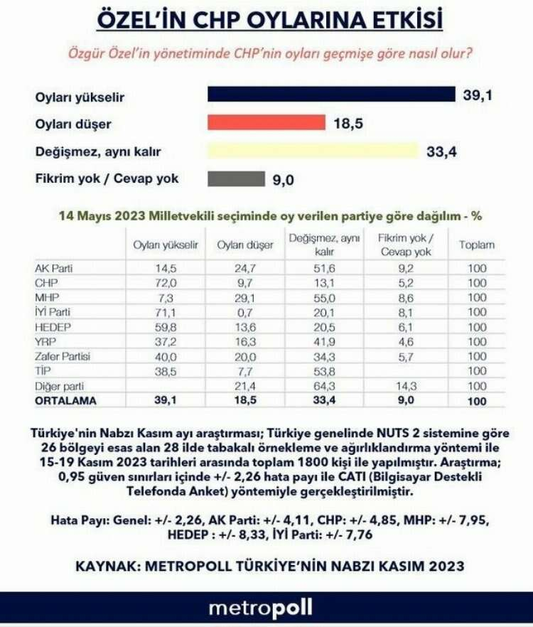 Ankette ‘Özgür Özel’in yönetiminde CHP’nin oyları geçmişe göre nasıl olur?’ sorusuna da yanıt arandı. Katılımcıların yüzde 39,1’i bu soruya ‘oyları yükselir’ diye yanıt verirken yüzde 18,5’lik bir oran da ‘oyları düşer’ şeklinde yanıt verdi. Yüzde 33,4’lük bir kesimin ise bu soruya ‘değişmez, aynı kalır’ şeklinde yanıt vermesi dikkat çekti.