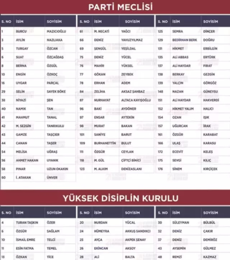 Parti Meclisi'nin yanı sıra Özel'in Disiplin Kurulu listesi de belli oldu. Listede; Turan Taşkın Özer, Özgür Sağlam, Süleyman Bülbül, Deniz Çakır gibi isimler yer aldı.