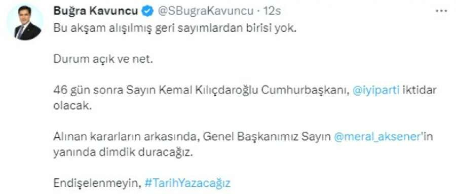 İYİ Parti Seçim Kampanyasından Sorumlu Genel Başkan Başdanışmanı Buğra Kavuncu da Twitter hesabından yaptığı paylaşımda şu ifadeleri kullandı: "Bu akşam alışılmış geri sayımlardan birisi yok. Durum açık ve net. 46 gün sonra Sayın Kemal Kılıçdaroğlu Cumhurbaşkanı, İYİ Parti iktidar olacak. Alınan kararların arkasında, Genel Başkanımız Sayın Meral Akşener'in yanında dimdik duracağız. Endişelenmeyin, #TarihYazacağız"