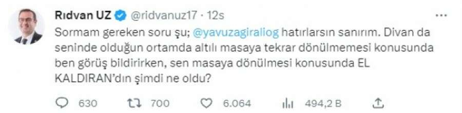 Sosyal medyada da istifasıyla birçok paylaşıma konu olan Ağıralioğlu'na, İYİ Parti Genel İdare Kurulu ve Kurucular Kurulu Üyesi Rıdvan Uz da tepki gösterdi. Twitter paylaşımında Uz, "Sormam gereken soru şu; Yavuz Ağıralioğlu hatırlarsın sanırım. Divanda senin de olduğun ortamda altılı masaya tekrar dönülmemesi konusunda ben görüş bildirirken, sen masaya dönülmesi konusunda el kaldırandın şimdi ne oldu?" ifadelerini kullandı.
