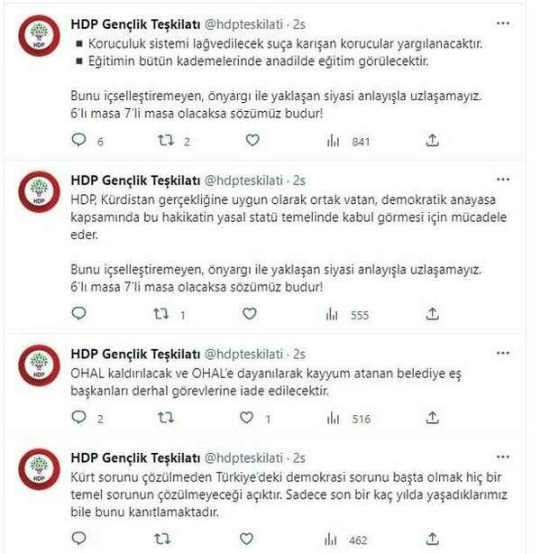HDP Gençlik Teşkilatı isimli oluşum ise sosyal medya hesabından yayınladıkları mesajla terör örgütü PKK'nın 6'lıya destek için sürdüğü şartlar da sıralamıştı.
