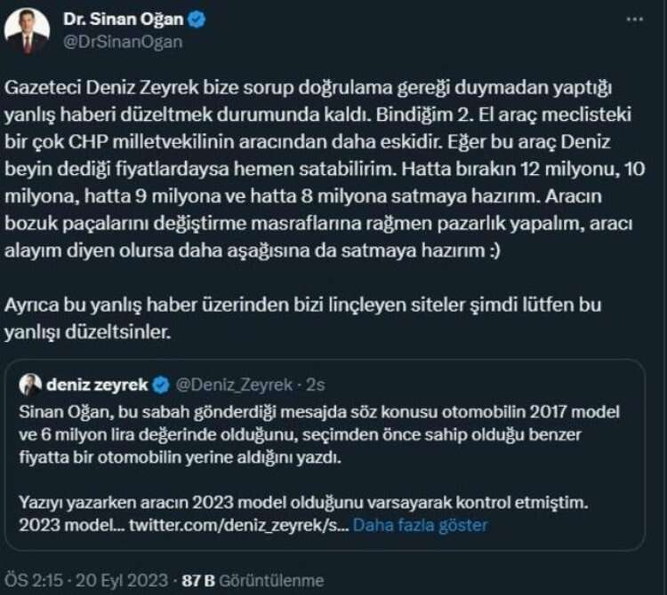"Gazeteci Deniz Zeyrek bize sorup doğrulama gereği duymadan yaptığı yanlış haberi düzeltmek durumunda kaldı. Bindiğim 2. El araç meclisteki bir çok CHP milletvekilinin aracından daha eskidir. Eğer bu araç Deniz beyin dediği fiyatlardaysa hemen satabilirim. Hatta bırakın 12 milyonu, 10 milyona, hatta 9 milyona ve hatta 8 milyona satmaya hazırım. Aracın bozuk paçalarını değiştirme masraflarına rağmen pazarlık yapalım, aracı alayım diyen olursa daha aşağısına da satmaya hazırım :)