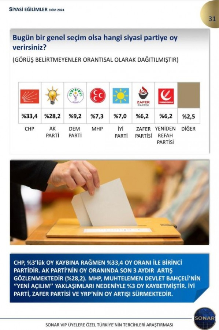 Son genel ve yerel seçim sonuçlarını doğru tahmin ederek dikkatleri üzerine çeken SONAR Araştırma Şirketi, VIP üyeleri için hazırladığı Ekim ayı anket sonuçlarını Gazeteci Şaban Sevinç X hesabında paylaştı.