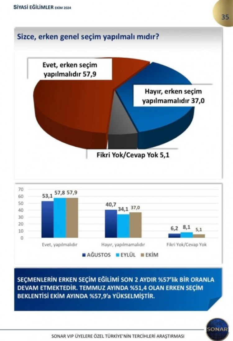 "Sizce erken seçim yapılmalı mı?" sorusuna cevap verenlerin oranı yüzde 57,9'a çıktı. Temmuz ayında ise aynı soruya "Evet" cevabını verenlerin oranı yüzde 51,4'tü.