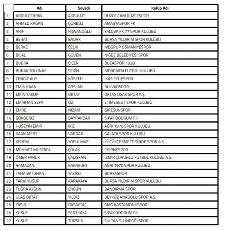 Türkiye Futbol Federasyonu'nca profesyonel liglere yönelik olarak yürütülen bahis soruşturması kapsamında 10.11.2025 tarihinde PFDK'ya sevk edilen 1024 futbolcunun haricinde sadece tek bir kere bahis hareketi olduğu görülen ve incelemesi devam eden 47 futbolcudan soruşturması tamamlanan aşağıdaki 27 futbolcunun Futbol Disiplin Talimatı'nın 57. maddesi uyarınca 09.12.2025 tarihinden itibaren tedbirli olarak PFDK'ya sevk edilmesine karar verilmiştir.