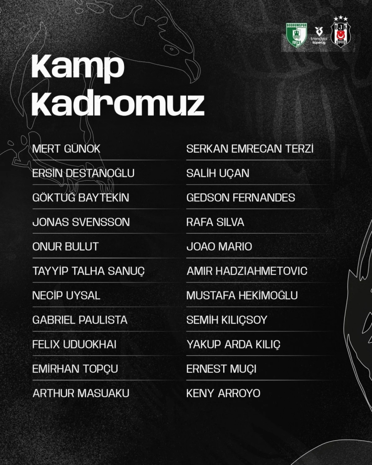 Beşiktaş'ın, Süper Lig’de yarın deplasmanda oynayacağı Bodrum FK maçının kamp kadrosu belli oldu.