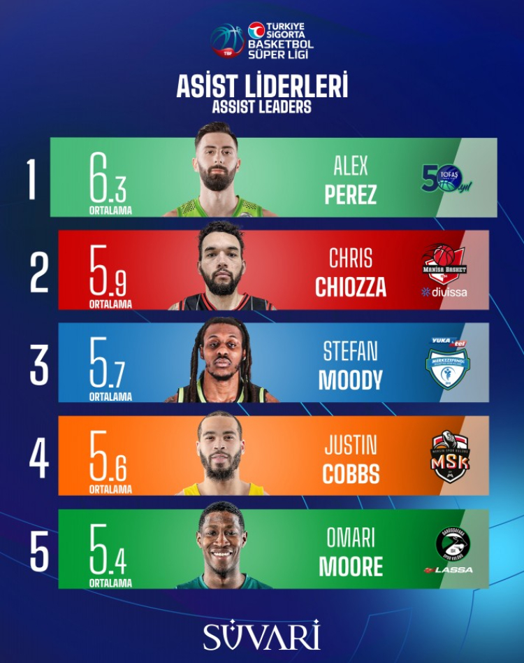 Türkiye Basketbol Federasyonu, Türkiye Sigorta Basketbol Süper Ligi 2024-2025 Asım Pars Sezonu'nda normal sezon MVP'si (en değerli oyuncu) ödülünün ardından lig liderlerini de açıkladı. TOFAŞ Basketbol Takımı oyuncuları Marcquise Reed ve Alex Perez istatistiklere damgasını vururken, BSL'de normal sezon MVP'si seçilen Marcquise Reed ödülünü Bahçeşehir Koleji ile oynanan play-off çeyrek final ilk maçı devre arasında Türkiye Basketbol Federasyonu (TBF) Sportif Direktörü Alper Yılmaz'dan almıştı. Reed, maç başı 17.6 sayı ortalamasıyla "sayı ortalaması lideri"; maç başı 1.7 top çalma (toplam 48) ortalamasıyla "top çalma lideri" ve maç başı 17.9 verimlilik puanı ortalamasıyla "verimlilik puanı lideri" olurken; Alex Perez de 27 maçta 6.3 asist ortalamasıyla "asist liderleri" sıralamasında zirvede yer aldı. Basketbol Süper Ligi'nde 2023-2024 sezonu normal sezon MVP'si de TOFAŞ'tan seçilmiş; bu ödülün sahibi Birleşik Amerikalı pivot Austin Wiley olmuştu.
