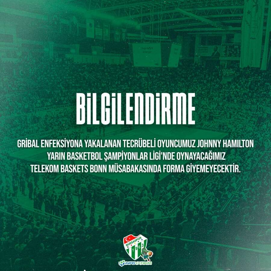 Tecrübeli pivot Johnny Hamilton'ın geçirdiği gribal enfeksiyon nedeniyle Bonn maçında forma giyemeyeceği kulüp tarafından açıklandı. 2,13 boyunda ve 29 yaşındaki Trinidad Tobago pasaportlu pivotun hastalanması yeşil-beyazlı takımın büyük üzüntü yarattı.