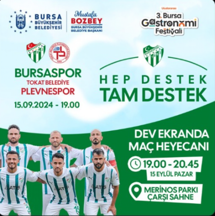 Bursa Büyükşehir Belediyesi, Uluslararası 3. Bursa Gastronomi Festivali'nin son gününde Merinos Park Çarşı Sahne'de saat 19:00'da başlayacak olan Bursaspor - Tokat Belediye Plevnespor maçı için dev ekran kuracağını duyurdu.