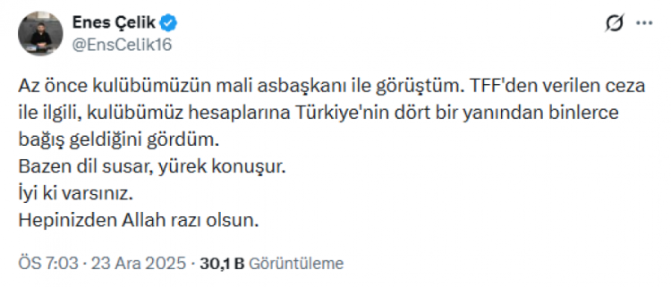 Profesyonel Futbol Disiplin Kurulu (PFDK), Bursaspor'a ceza verdiğini açıklamıştı. Başkan Enes Çelik sosyal medya hesabı üzerinden yaptığı açıklamada Türkiye'nin dört bir yanından Bursaspor'a destek olmak adına bağış geldiğini açıkladı!