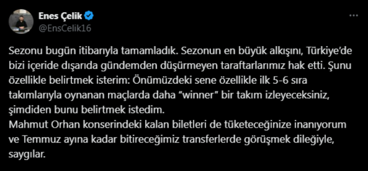 Sezonu bugün itibarıyla tamamladık. Sezonun en büyük alkışını, Türkiye'de bizi içeride dışarıda gündemden düşürmeyen taraftarlarımız hak etti. Şunu özellikle belirtmek isterim: Önümüzdeki sene özellikle ilk 5-6 sıra takımlarıyla oynanan maçlarda daha "winner" bir takım izleyeceksiniz, şimdiden bunu belirtmek istedim. Mahmut Orhan konserindeki kalan biletleri de tüketeceğinize inanıyorum ve Temmuz ayına kadar bitireceğimiz transferlerde görüşmek dileğiyle, saygılar.