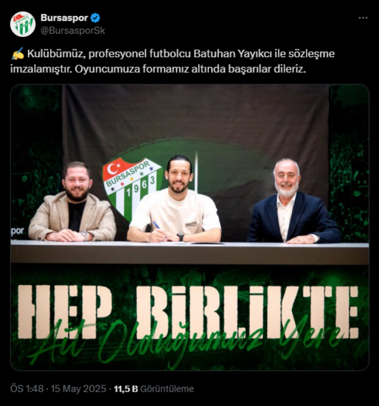 Bursaspor Kulübü yayımladığı mesajda, "Kulübümüz, profesyonel futbolcu Batuhan Yayıkcı ile sözleşme imzalamıştır. Oyuncumuza formamız altında başarılar dileriz." ifadelerini kullandı.
