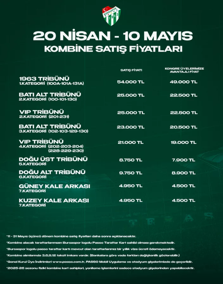 Tribün tribün kombine fiyatları (20 Nisan 10 Mayıs Dönemi)