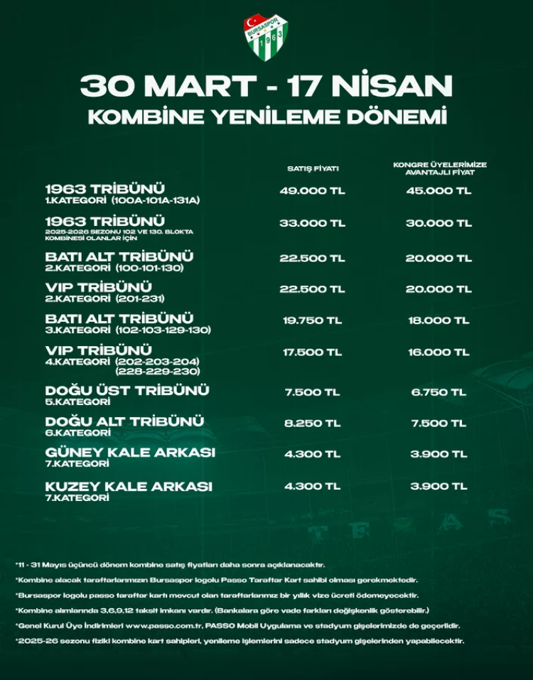 1963 Tribünü (mevcut kombine sahipleri): 33.000 TL (Üyelere 30.000 TL)
