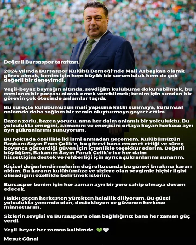 Günal, yaptığı açıklamada, "2024 yılında Bursaspor Kulübü Derneği'nde Mali Asbaşkan olarak görev almak, benim için hem büyük bir sorumluluk hem de çok değerli bir deneyimdi. Yeşil-beyaz bayrağın altında, sevdiğim kulübüme dokunabilmek, bu camianın bir parçası olarak emek verebilmek; benim için sıradan bir görevin çok ötesinde anlamlar taşıdı. Bu süreçte kulübümüzün mali yapısına katkı sunmaya, kurumsal anlamda daha sağlam bir zemin oluşturmaya gayret ettim. Bazen zorlu, bazen yorucu; ama her daim anlamlı bir yolculuktu. Bu yolculukta emeğini, zamanını ve enerjisini ortaya koyan herkese ayrı ayrı şükranlarımı sunuyorum. Bu noktada özellikle iki ismi anmadan geçemem. Kulübümüzün Başkanı Sayın Enes Çelik'e, bu görevi bana emanet ettiği ve süreç boyunca gösterdiği güven için içtenlikle teşekkür ederim. Değerli büyüğüm, Bakanım Sayın Faruk Çelik'e ise her daim hissettiğim destek ve rehberliği için ayrıca şükranlarımı sunarım. Kişisel değerlendirmelerim doğrultusunda bu görevi bırakma kararı aldım. Bu kararın kulübümüze ve sizlere olan sevgimle hiçbir ilgisi olmadığını özellikle belirtmek isterim. Bursaspor benim için her zaman ayrı bir yere sahip olmaya devam edecek. Hakkı geçen herkesten yürekten helallik diliyorum. Bu güzel yolculukta yanımda olan, destekleyen ve güvenen herkese minnettarım. Sizlerin sevgisi ve Bursaspor'a olan bağlılığınız bana her zaman güç verdi. Yeşil-beyaz her zaman kalbimde" ifadeleriyle istifa ettiğini duyurdu.