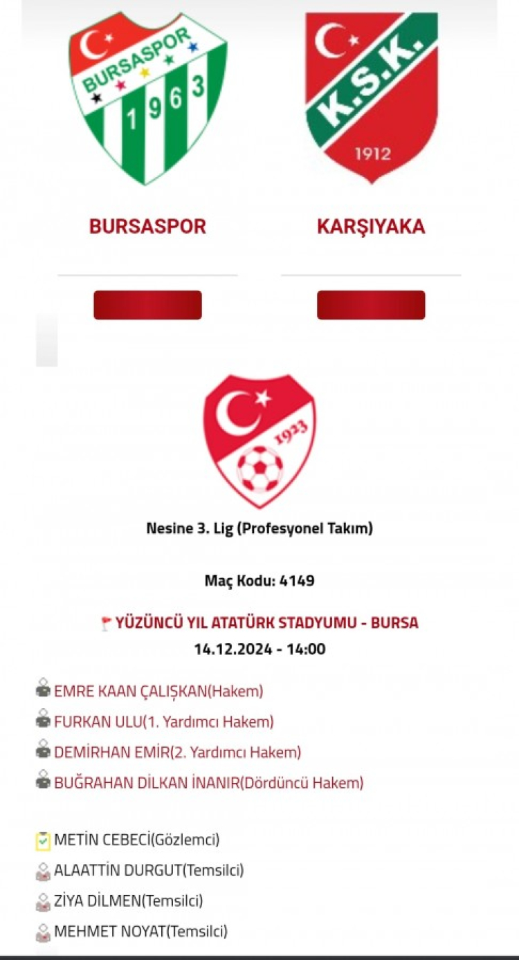 Bursaspor Nesine 3. Lig 1.Grup 15. Haftasında sahasında ağırlayacağı rakibi Karşıyaka maçını Ankara Bölgesi hakemi Emre Kaan Çalışkan yönetecek.