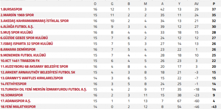 Böylece Türkiye Nesine 2. Lig'de 16. haftanın tamamlanması ile puan cetvelinde Bursaspor 1 puan fark ile Mardin 1969 Spor'u geride bırakarak liderlik koltuğuna oturdu.