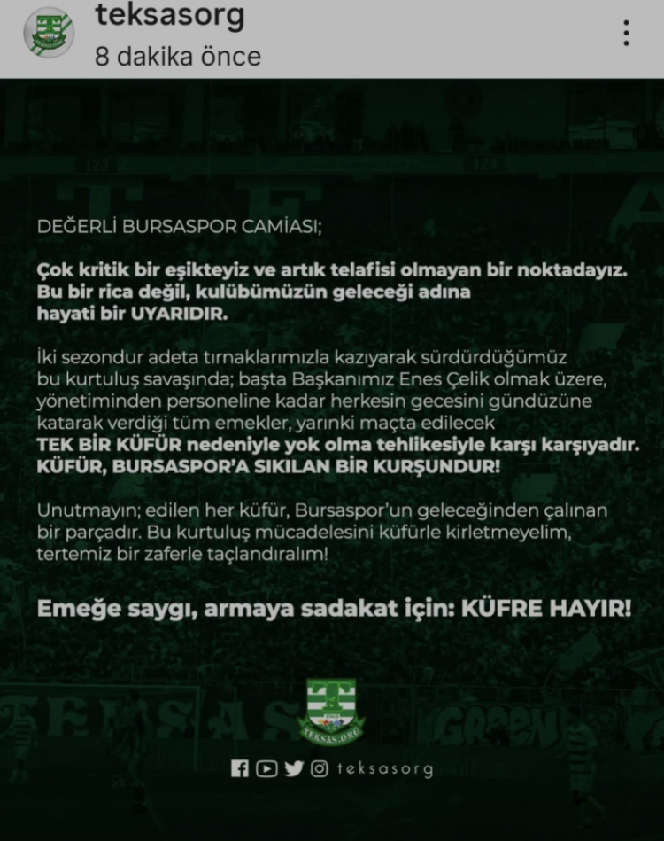Unutmayın; edilen her küfür, Bursaspor'un geleceğinden çalınan bir parçadır.