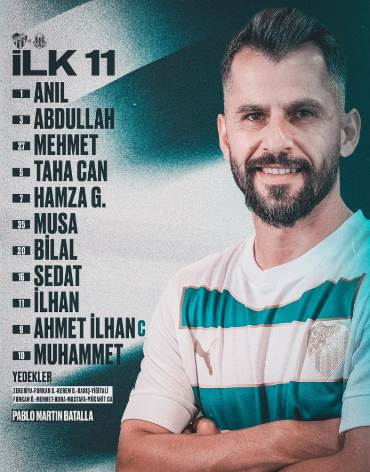 Musa Çağıran'ın kırmızı kart cezası biterken Bursaspor'da U20 Milli Takımı'na giden Eren Tunalı dışında eksik bulunmuyor. Teknik Direktör Pablo Martin Batalla Eren'in yokluğunda nasıl bir hamle yapacağı ise merak konusu.