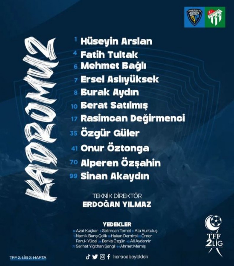 TFF 2. Lig Beyaz Grup'ta bu akşam Karacabey'de oynanacak Karacabey Belediyespor-Bursaspor maçının kadroları belli oldu.
