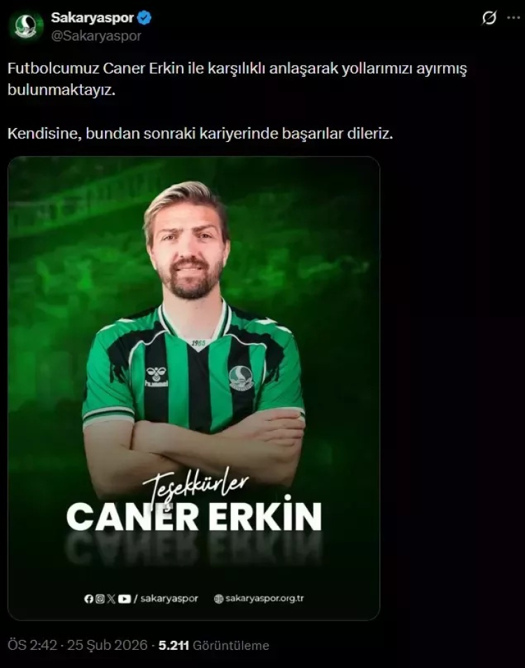 Sakaryaspor yönetimi, uzun süredir merak edilen soruya resmi bir yanıt verdi. Kulüp tarafından yapılan açıklamada, "Sezon başında kadromuza kattığımız profesyonel futbolcumuz Caner Erkin ile karşılıklı anlaşarak yollarımızı ayırmış bulunmaktayız. Kendisine bundan sonraki kariyerinde başarılar dileriz." ifadelerine yer verildi.