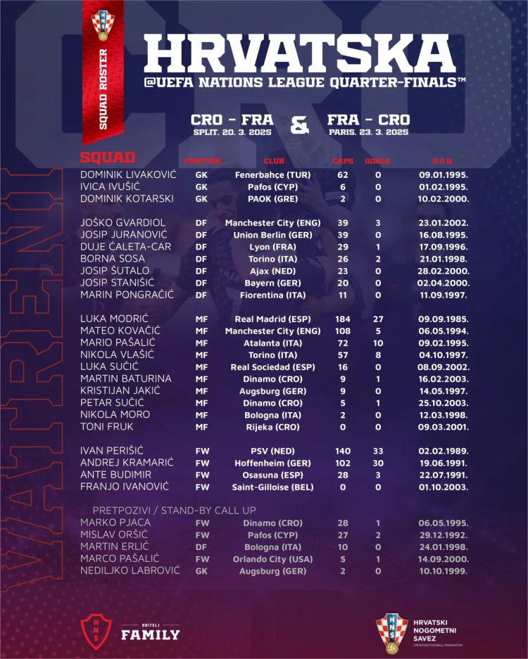 Hırvatistan'ın Fransa ile oynayacağı UEFA Uluslar Ligi çeyrek final maçlarının aday kadrosu şu şekilde: