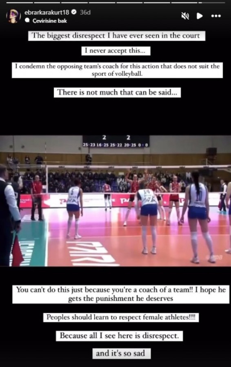 Mücadelenin ardından olaya tepki gösteren Ebrar Karakurt sosyal medya hesabından yaptığı açıklamada, "Sahada gördüğüm en büyük saygısızlık. Bunu asla kabul etmiyorum... Voleybol sporuna yakışmayan bu hareketten dolayı karşı takım hocasını kınıyorum. Söylenecek çok şey yok" ifadelerini kullandı.