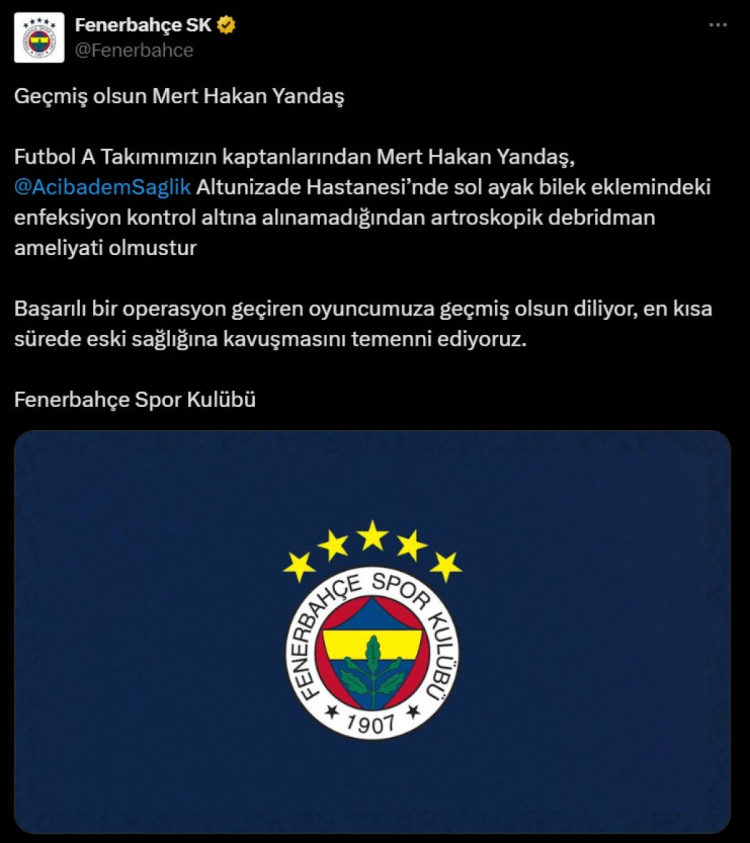 Fenerbahçe, Mert Hakan Yandaş’ın sol ayak bilek eklemindeki enfeksiyonun kontrol altına alınamadığından artroskopik debridman ameliyatı olduğunu açıkladı.