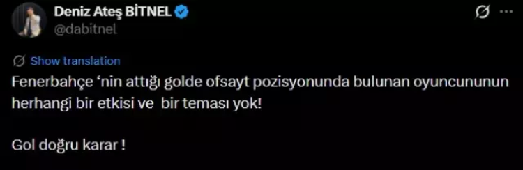 Deniz Ateş Bitnel, "Fenerbahçe 'nin attığı golde ofsayt pozisyonunda bulunan oyuncunun herhangi bir etkisi ve bir teması yok! Gol doğru karar!" dedi.