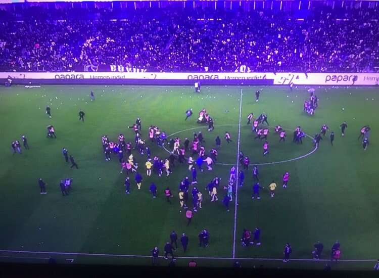 Daha fazla taraftar sahaya girince yumruklar havada uçuştu.