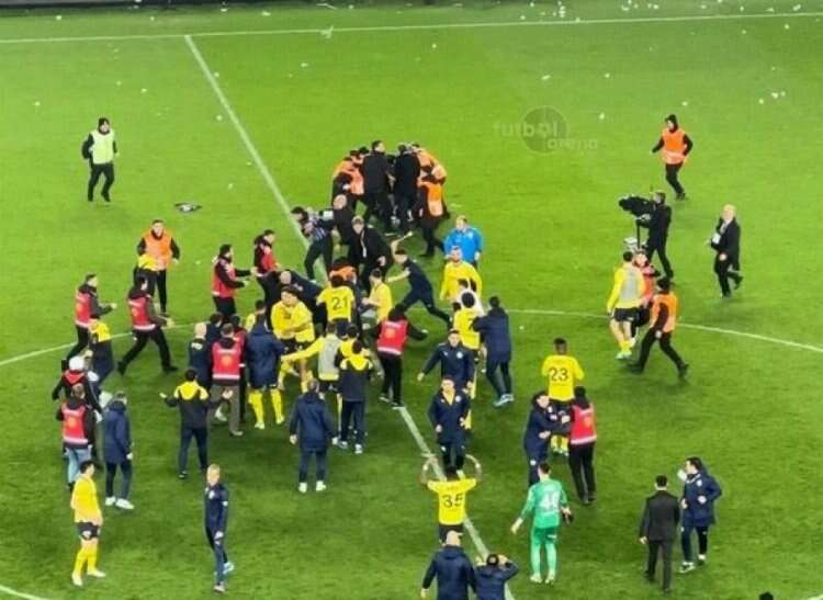 Bunun üzerine sarı-lacivertli futbolcular, sahaya inen taraftarlara karşılık verince saha karıştı.